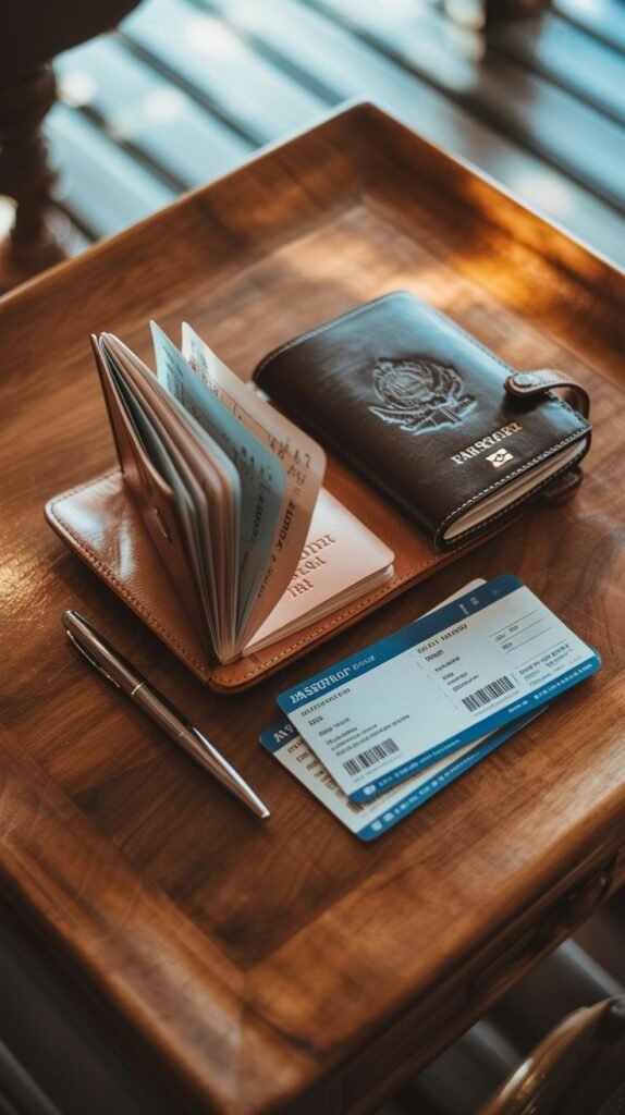 This includes your passport, visa (if needed), travel insurance, flight tickets, hotel confirmations, driver’s license, and emergency contact info.