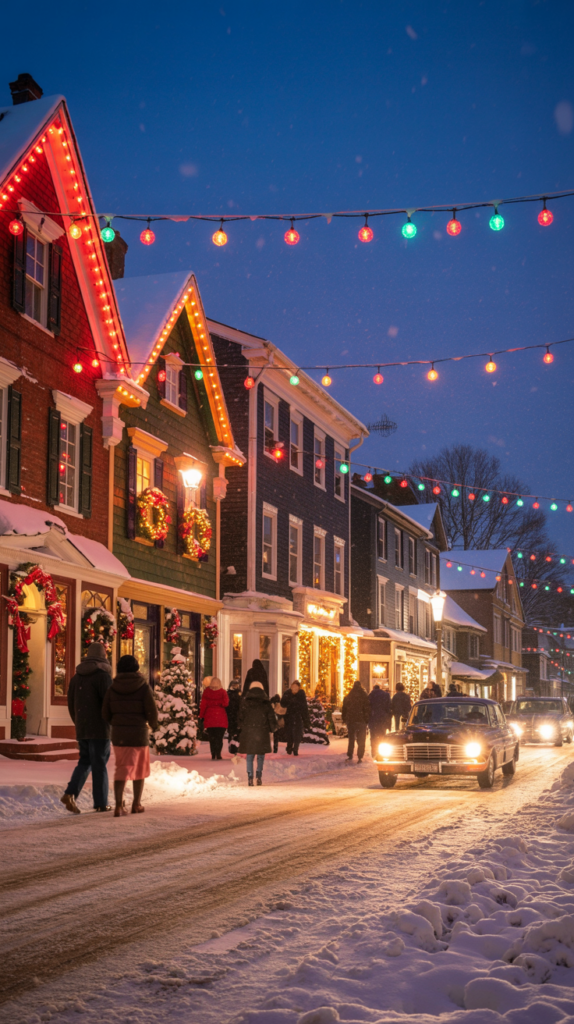 - Historic Main Street decorated with lights and wreaths