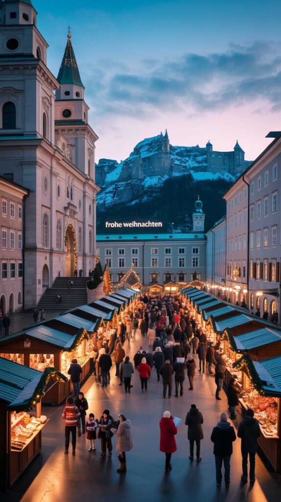 Salzburg is a dreamlike winter wonderland with snow-covered Alps, historic squares, and charming Christmas markets.