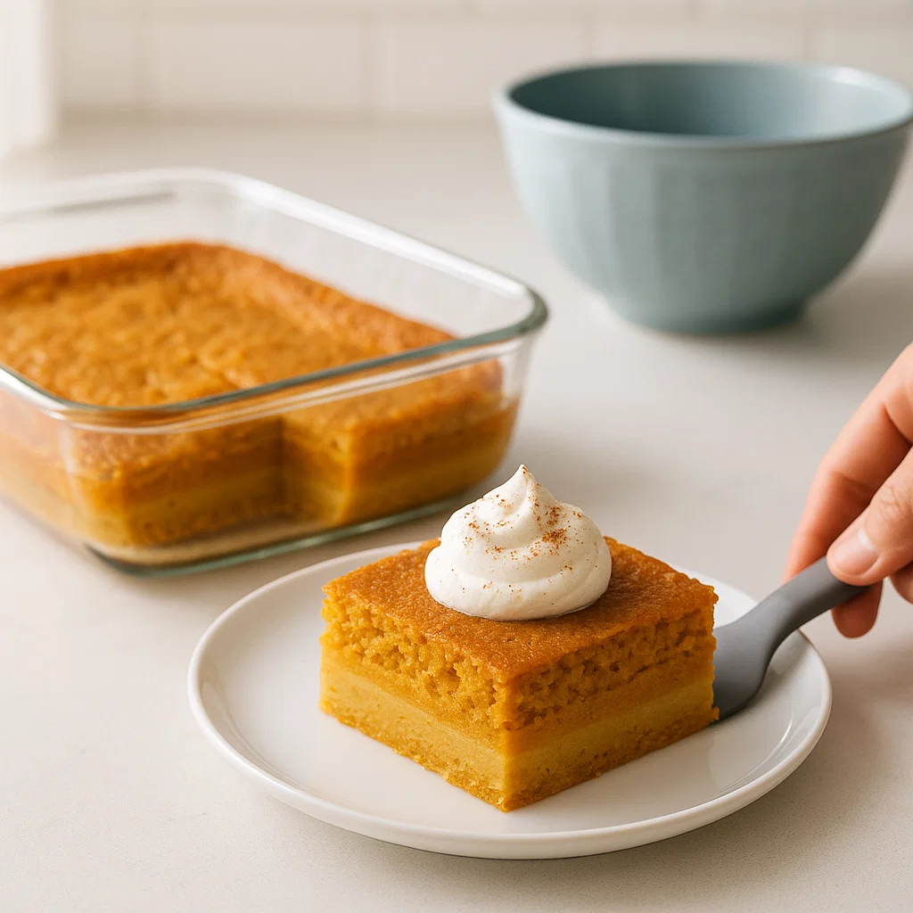 As it bakes, the magic happens: the pumpkin creates a soft, custard-like layer at the bottom of the cake, while the cake mix rises to form a moist, golden filling. It’s like you’re getting the best of both worlds: a pumpkin pie meets cake experience!