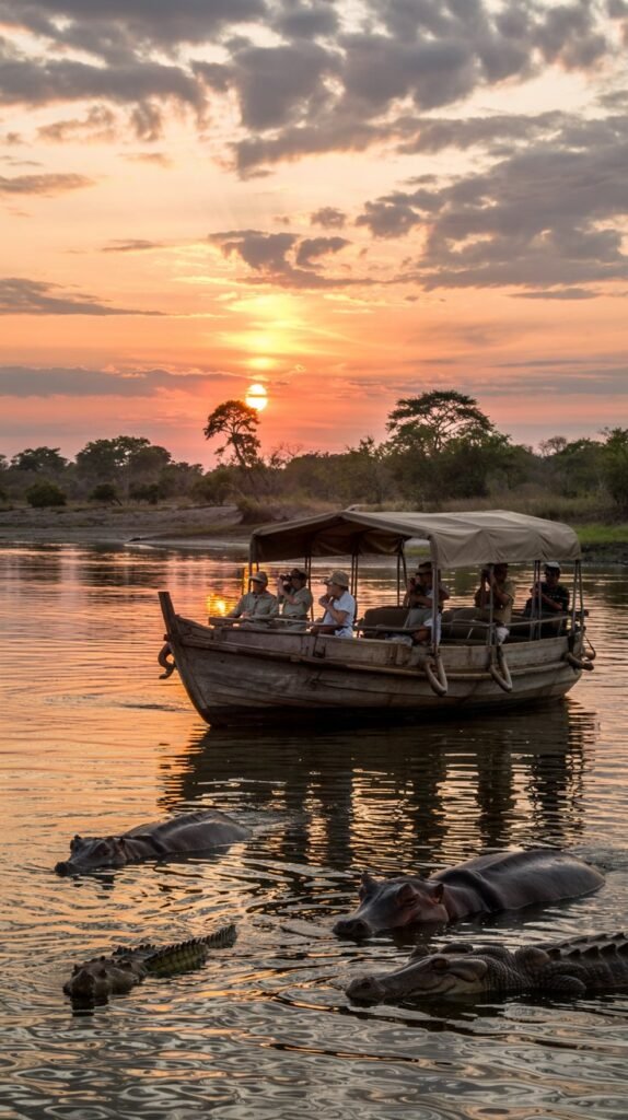 Think elephants bathing, wild dogs hunting, and boat safaris at sunset.