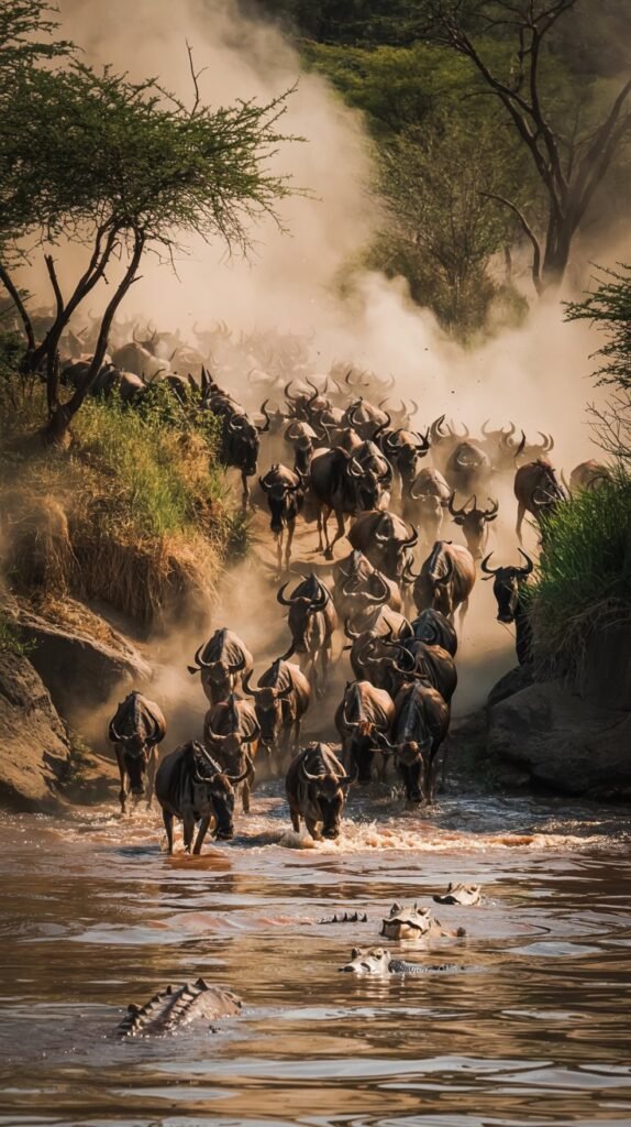 Picture endless golden plains alive with movement herds of wildebeest thundering across rivers, leaping to escape crocodiles, lions prowling in the tall grass.
