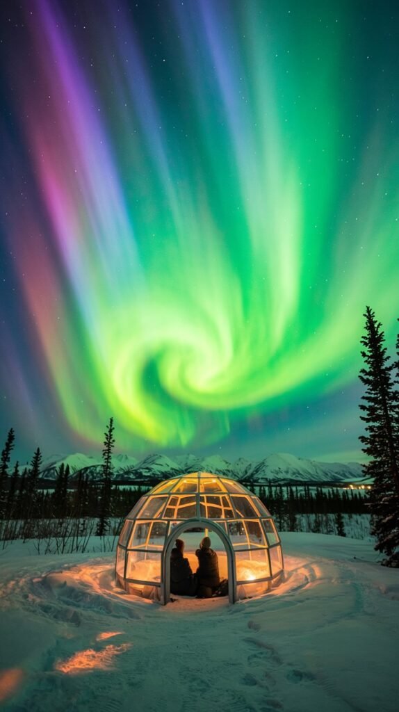 Stay in glass igloos or heated domes and witness the sky come alive with swirling greens and purples.