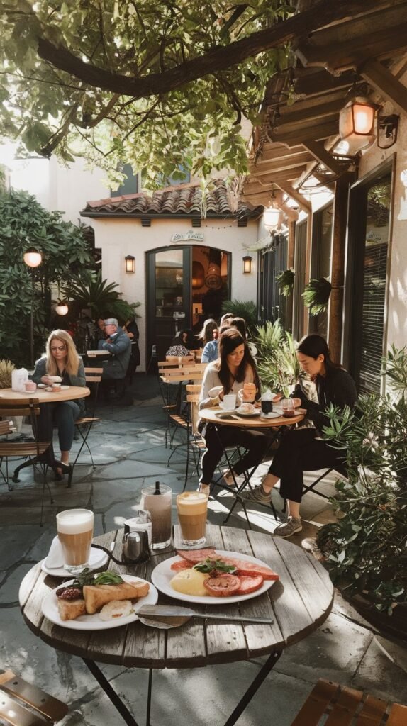 Start your morning at this beautiful café known for fresh pastries, hearty brunch options, and lush patio seating. Try the breakfast burrito or the eggs benedict paired with a latte.