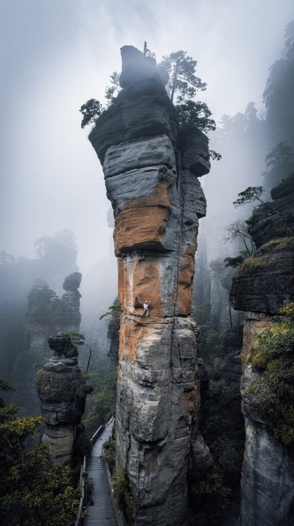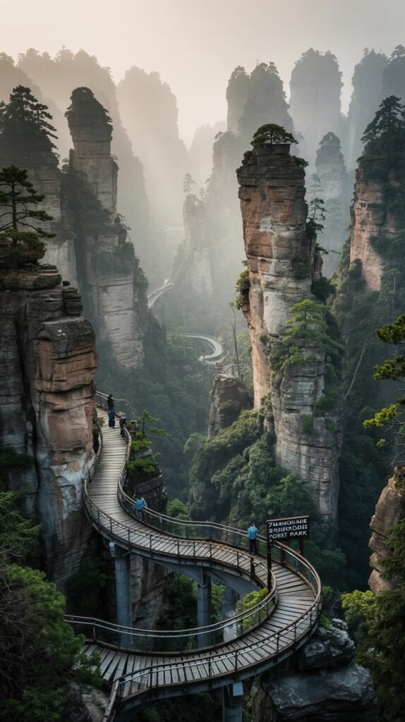 Mist curls around the peaks, glass bridges stretch over dizzying drops, and every viewpoint feels like stepping into a fantasy world.