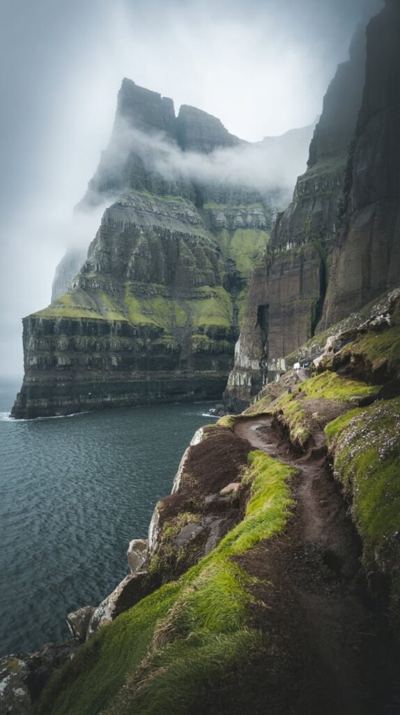 Waterfalls tumble off cliffs into the sea, sheep outnumber humans, and the fog adds a layer of cinematic mystery.