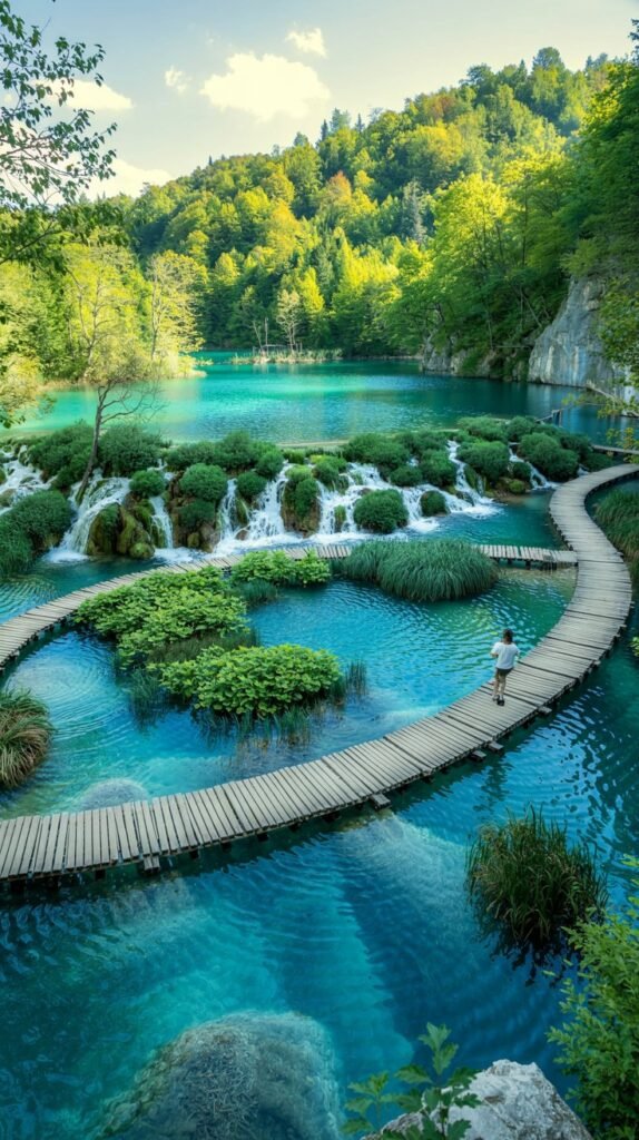 Imagine a staircase made of waterfalls that’s Plitvice Lakes.