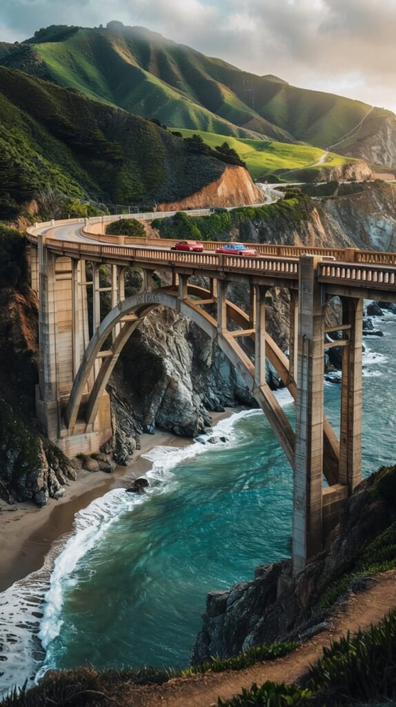 Highway 1 twists along cliffs that drop straight into the Pacific, with waves crashing far below.