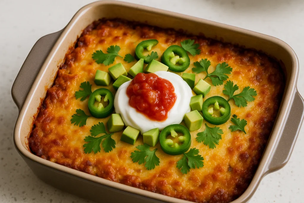 Serve and enjoy: Once your casserole dish is out of the oven, let it cool for a few minutes. Then, top it with a dollop of sour cream, a dollop of salsa, and any other toppings you like, like diced avocado, cilantro, or jalapeños.