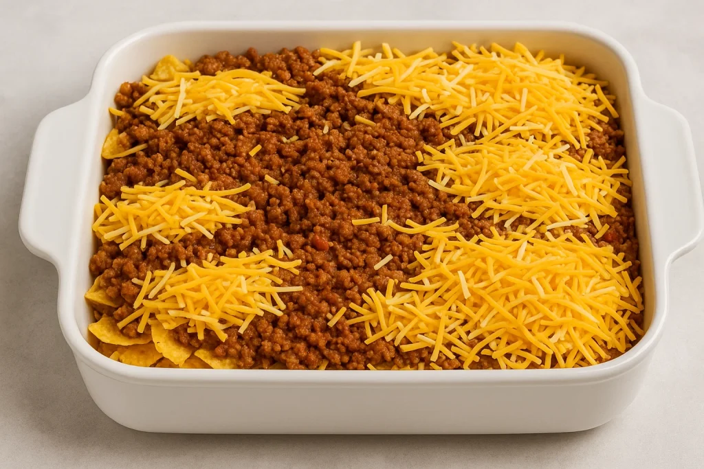 Stack the casserole dish: Butter a 9×13-inch baking dish. Start by spreading a layer of crushed tortilla chips on the bottom. Top with a layer of the seasoned beef mixture, followed by a generous sprinkling of shredded cheese. Repeat layers until all your ingredients are used up, ending with a layer of cheese on top.