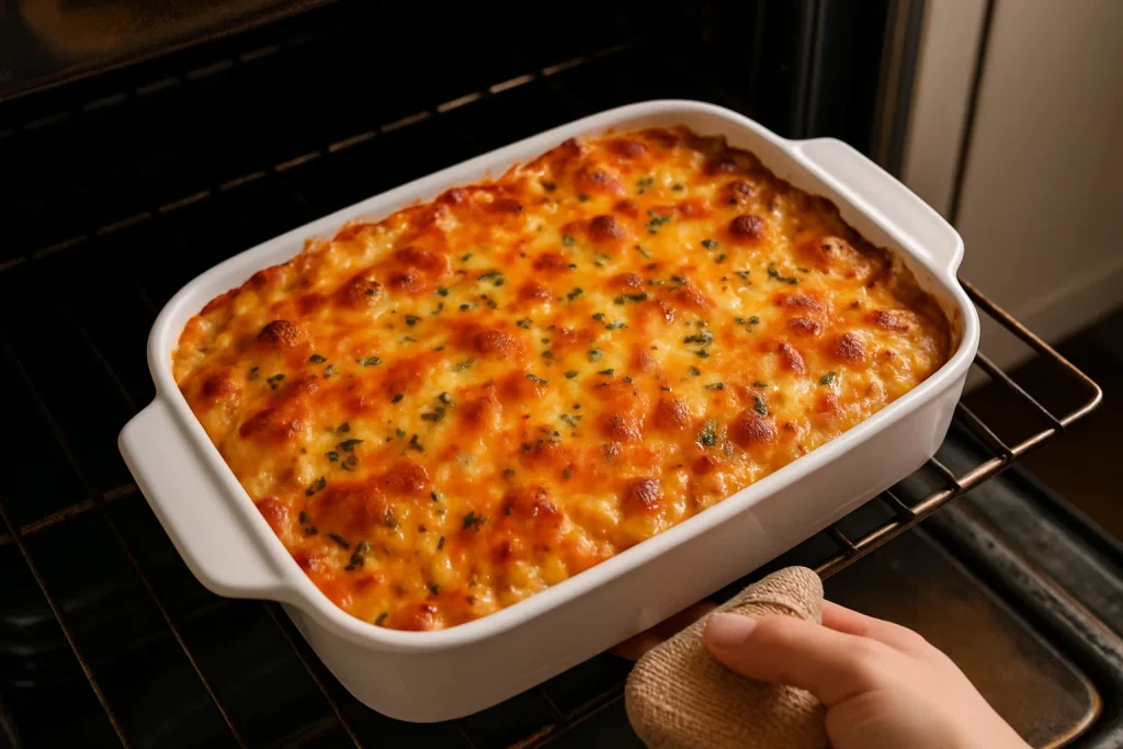 Cook: Place the casserole dish in your preheated oven and bake for about 20-25 minutes, or until the cheese is melted and bubbling. You’ll know it’s ready when the top is golden brown and everything is wonderfully melted.