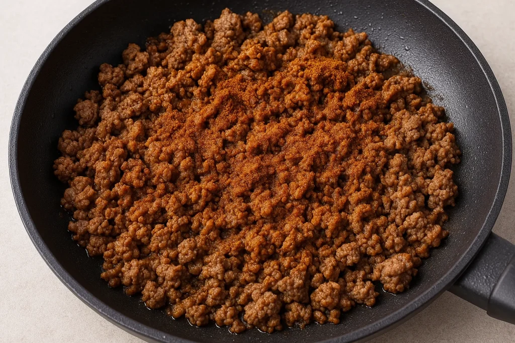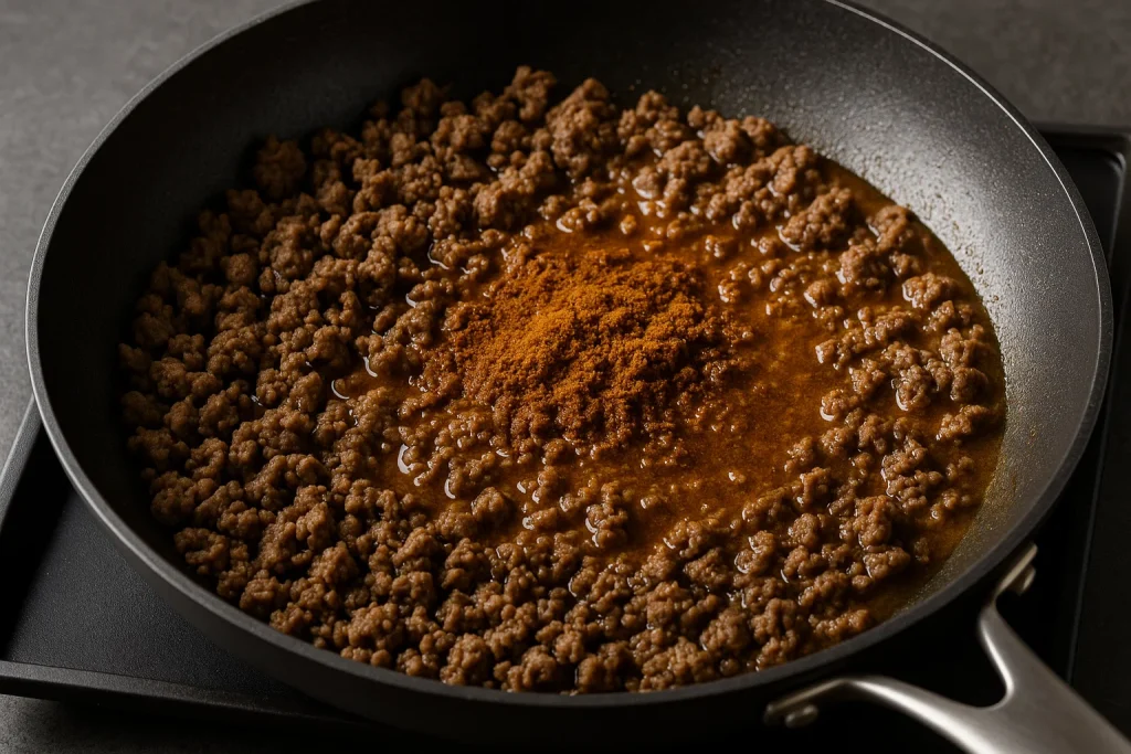 Cook the ground beef: In a large skillet, cook your ground beef over medium heat until browned. Drain any excess fat, then stir in the taco seasoning and a little water. Let simmer for a few minutes to bring together the flavors.