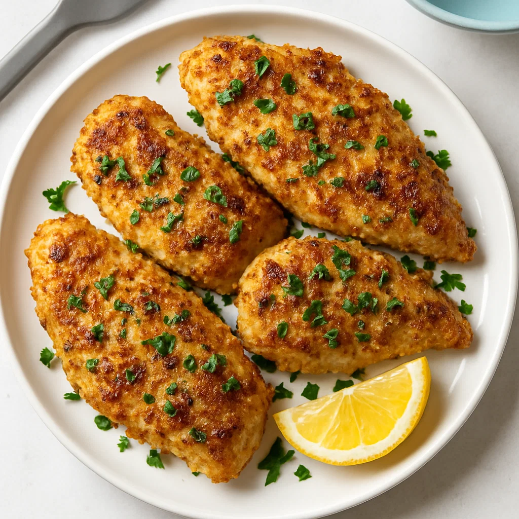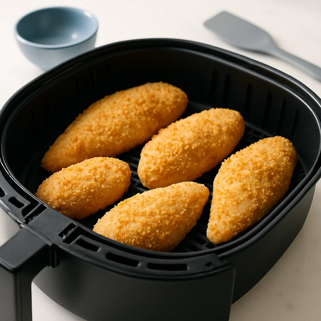 Preheat your air fryer to 380°F (190°C). Lightly brush the coated chicken with a little more olive oil for an even crispier finish. Place the chicken in the air fryer basket in a single layer – be sure not to overcrowd the basket. Air fry for about 10 minutes, then flip the chicken and air fry for another 8-10 minutes. The chicken should reach an internal temperature of 165°F (74°C) and the breading will be golden and crispy.