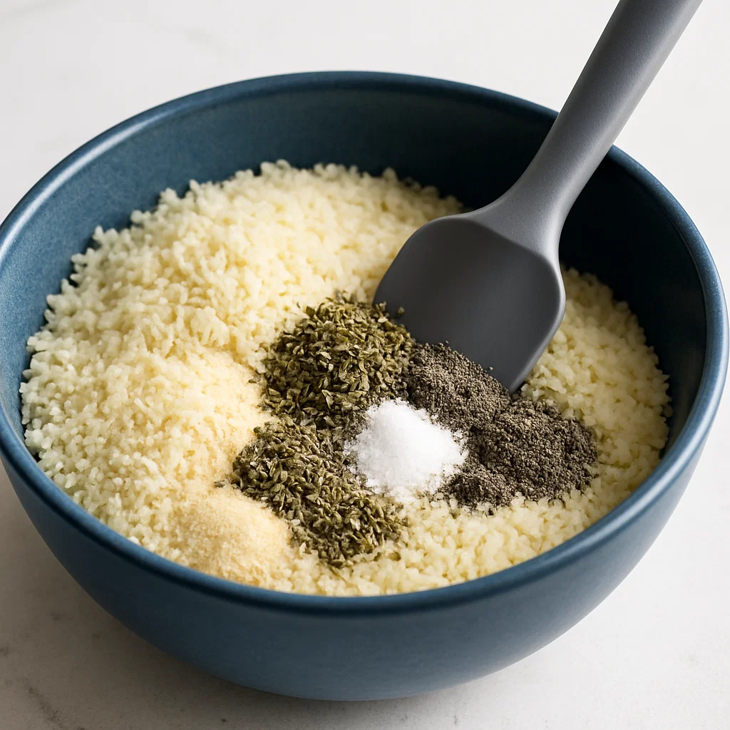 In another bowl, mix Parmesan cheese, breadcrumbs, garlic powder, onion powder, dried oregano, saltAnd pepper. This mixture will form the crispy, golden exterior of the chicken.