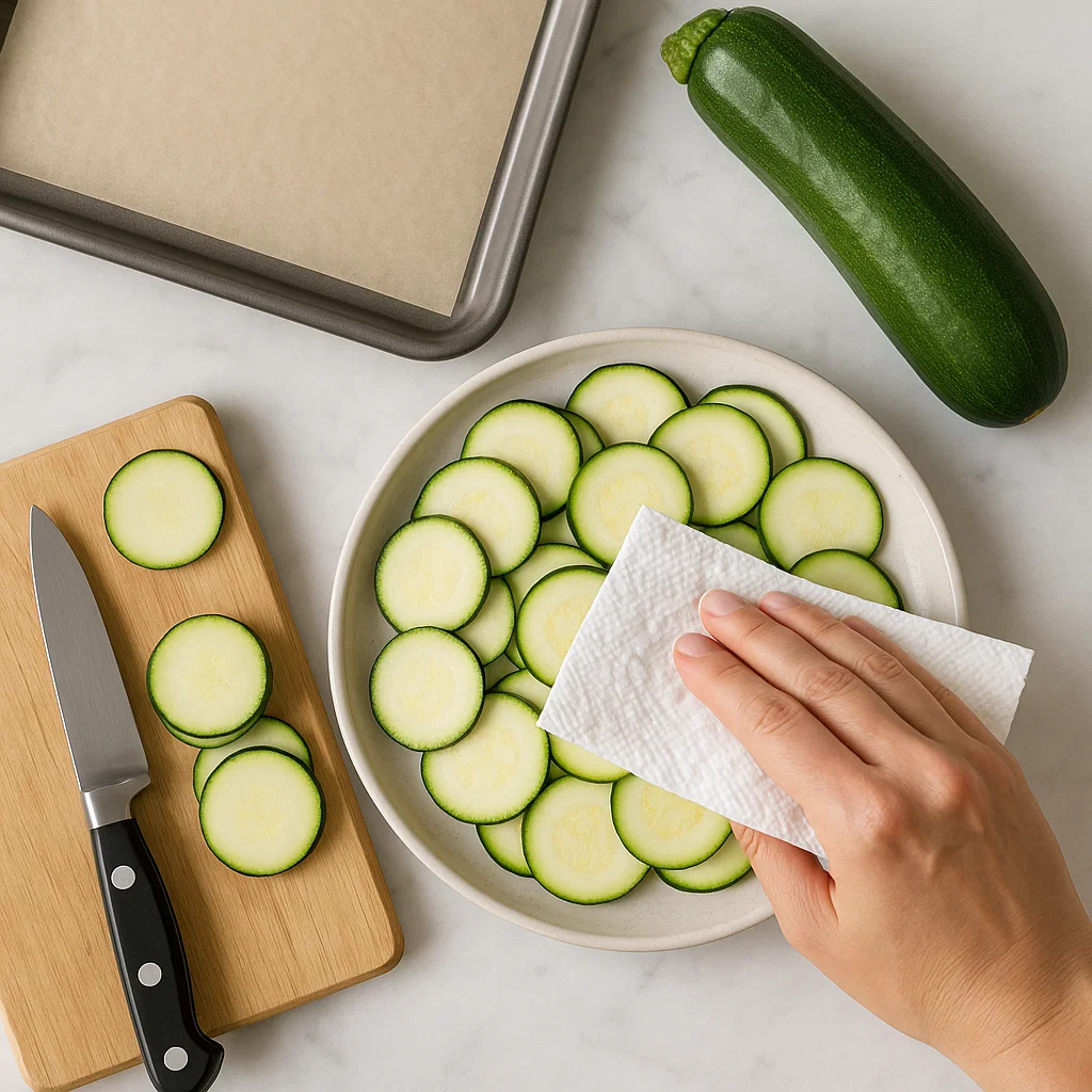 3. Dry the zucchini slices with a paper towel to remove excess moisture. This will help them get crispy in the oven.