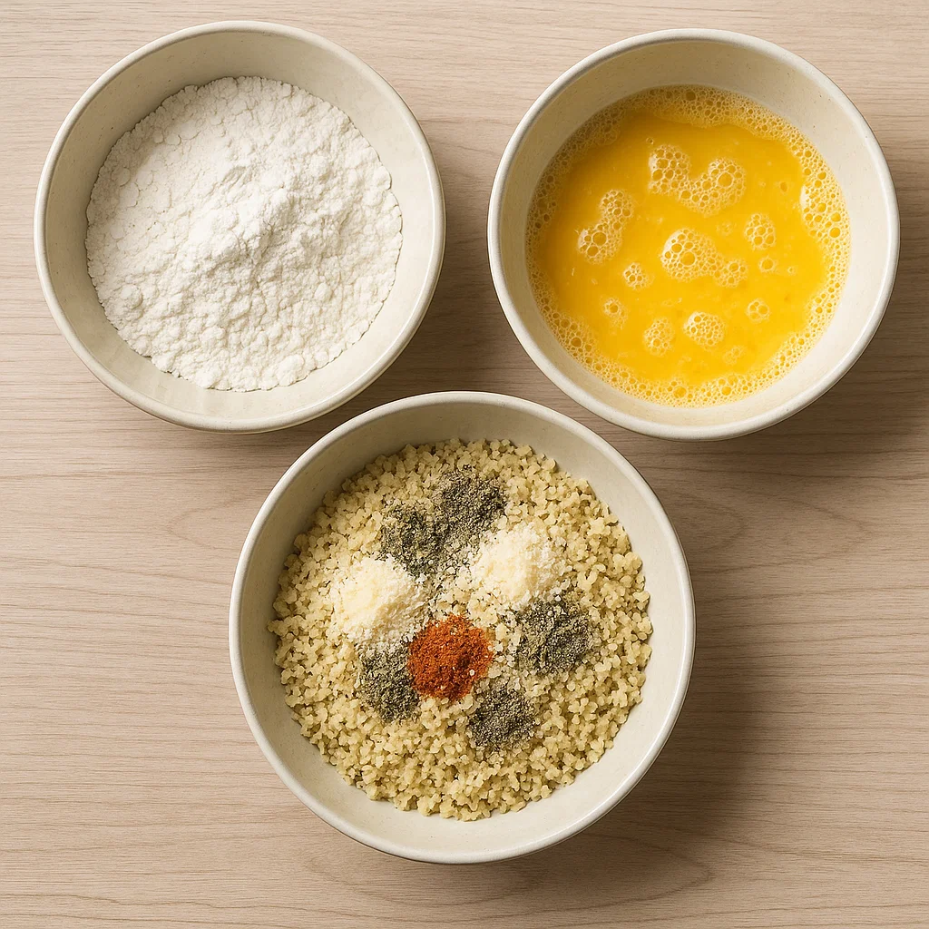 3. In a third shallow bowl, mix the panko breadcrumbs, Parmesan cheese, garlic powder, onion powder, paprika, saltAnd pepper.