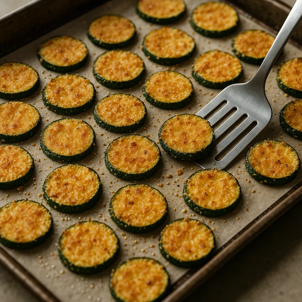 1. Once the zucchini chips are crispy and golden, remove them from the oven and let them cool slightly on the baking sheet.