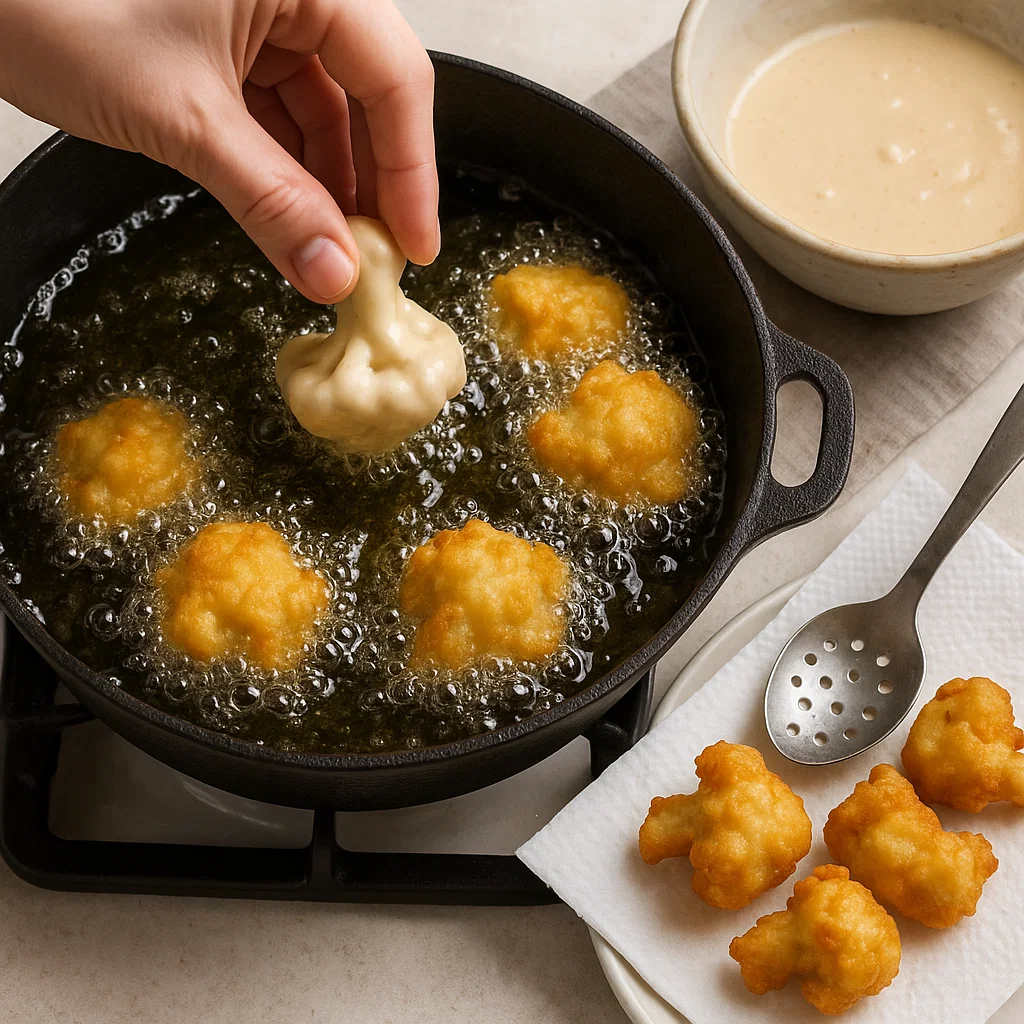 Pour enough vegetable oil into a deep skillet or saucepan to submerge the cauliflower. Heat the oil over medium-high heat until it reaches about 350°F (175°C). You can test the oil by pouring a little bit of paste into it; if it bubbles immediately, the oil is ready.