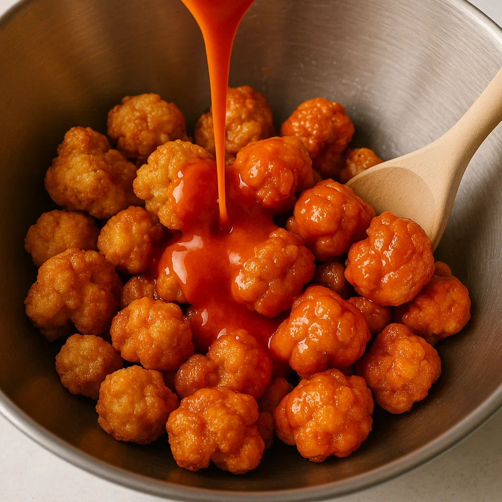 Once all the cauliflower is fried, place it in a large mixing bowl. Pour the hot sauce over the crispy cauliflower and toss gently until each piece is well coated.