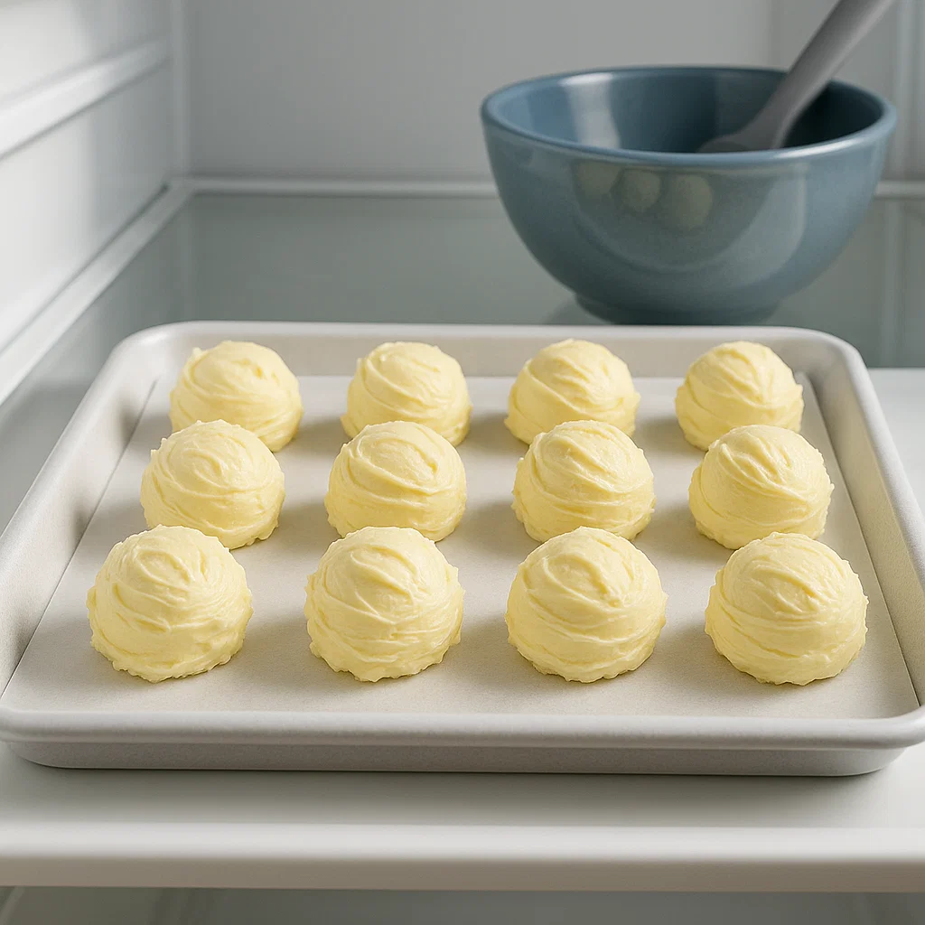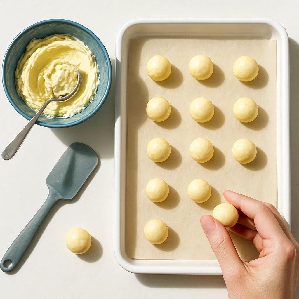 Using a small spoon or cookie scoop, scoop out a small amount of buttercream and roll it into a ball with your hands. Aim for bite-sized pieces and try to make them as uniform as possible. Place the buttercream balls on a baking sheet lined with parchment paper.