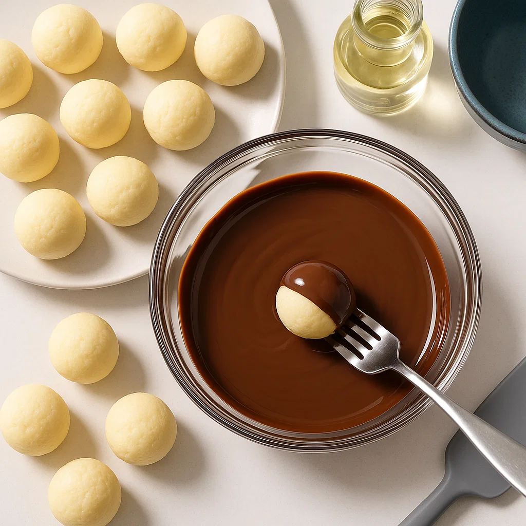 While the buttercream balls are cooling, it’s time to prepare the chocolate coating. In a microwave-safe bowl, melt the chocolate chips in the microwave, stirring every 20 to 30 seconds to avoid burning. Once melted, add the vegetable oil to give the chocolate a smooth, shiny finish.