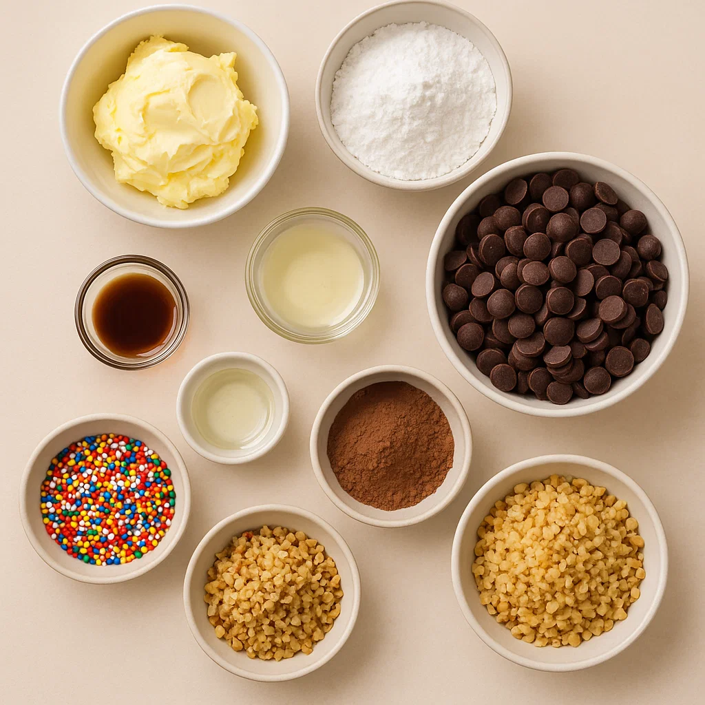• Optional decorations: chips, cocoa powder or finely chopped nuts for rolling