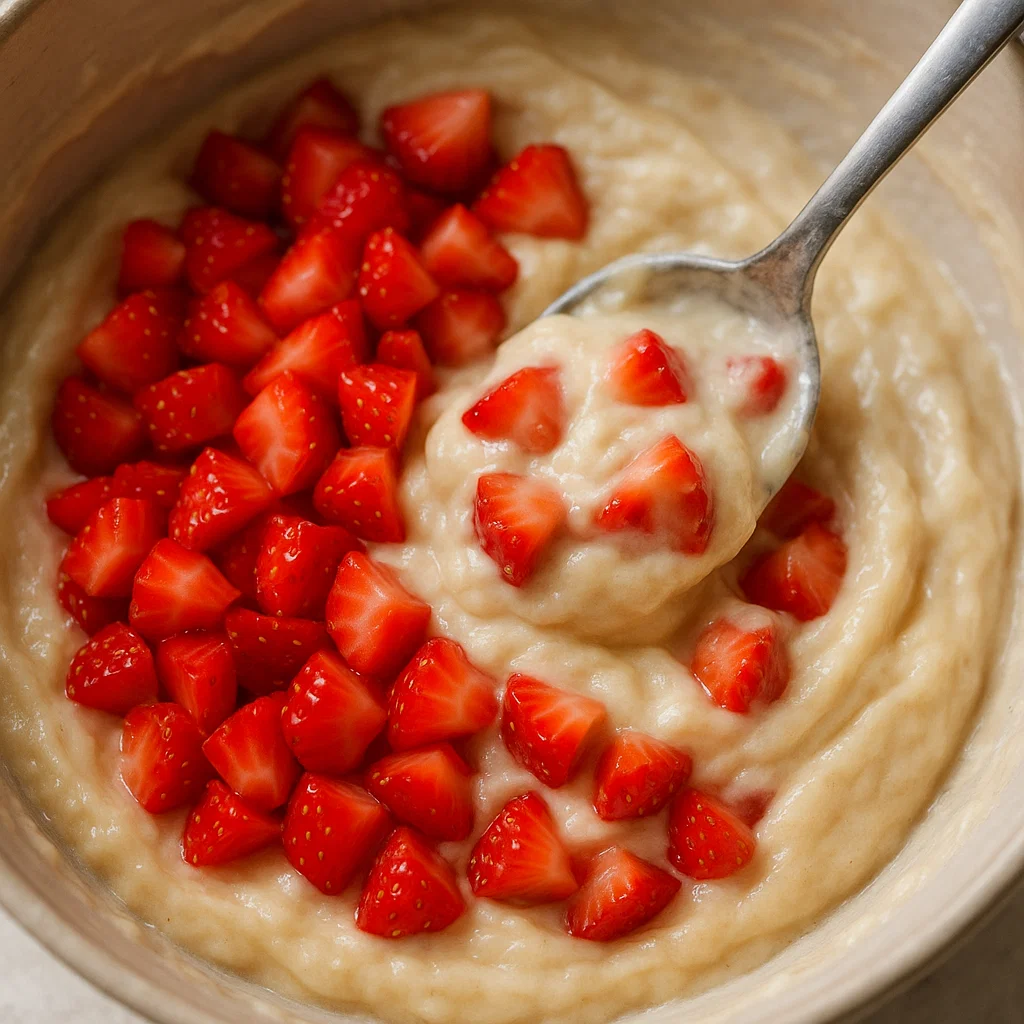 Once your dough is ready, gently incorporate the chopped strawberries. Try not to overmix to keep those juicy pockets of fruit intact.