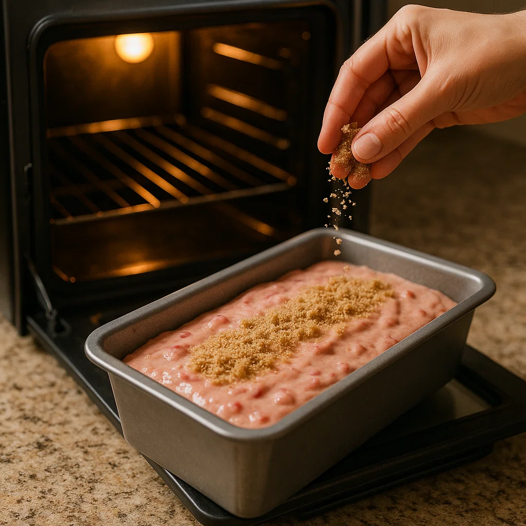 Pour the batter into the prepared loaf pan and smooth out from above. If you want a little extra sweetness, sprinkle brown sugar on top of the dough before baking. Place the mold in the oven and bake for about 55-60 minutes. Check the bread by inserting a toothpick into the center: if it comes out clean, it’s ready. Once the bread is baked, let it cool in the pan for about 10 minutes before transferring it to a wire rack to cool completely.