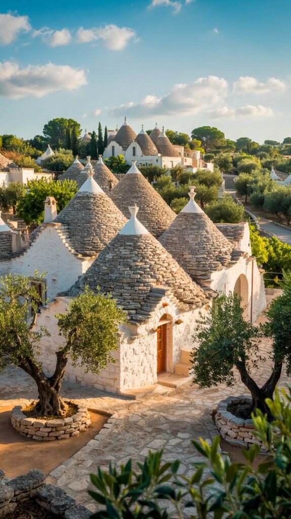 Known for its distinctive trulli—whitewashed, cone‑roofed stone huts—Alberobello in Puglia looks like a village of hobbit houses.