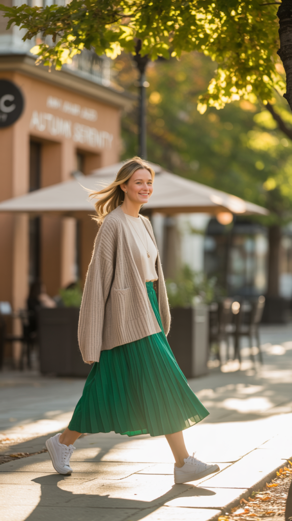 Combining a cozy cardigan with a flowing midi skirt creates a mix of texture and movement while staying comfy.