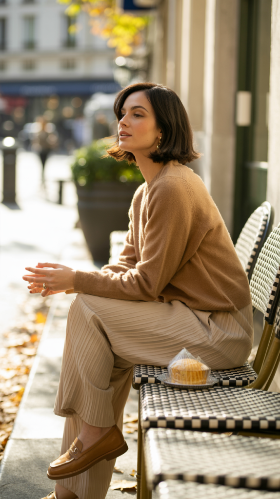 - Pants: High-waisted pleated trousers in camel, beige, or plaid patterns elevate the outfit.