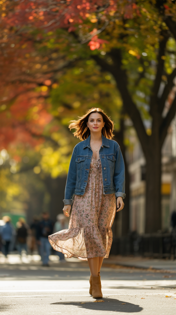 A lightweight denim jacket paired with a layered dress is perfect for transitional fall days.