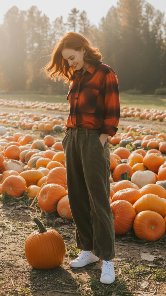 - Pants: High-waisted corduroy pants in tan, rust, or olive enhance the fall aesthetic.