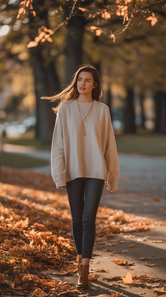- Sweater: Go for a soft cashmere or knit in warm autumn tones.