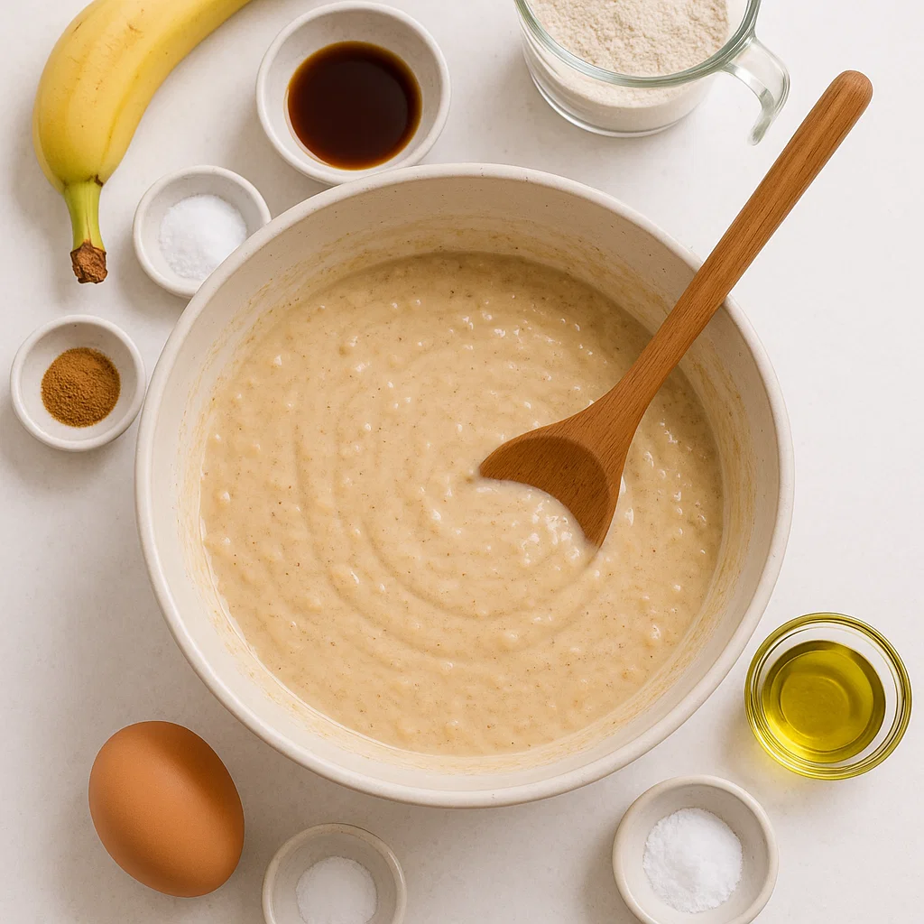 - Add the mixed oat flour, almond milk, vanilla extract, baking powder, cinnamon (if you use it), salt, eggAnd olive oil with banana puree. Mix everything together until well combined.