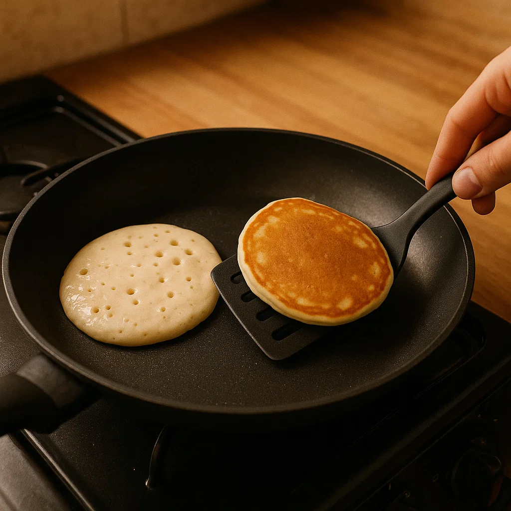 - Pour approximately 1/4 cup of dough on the pan for each pancake, spreading it into a round shape.