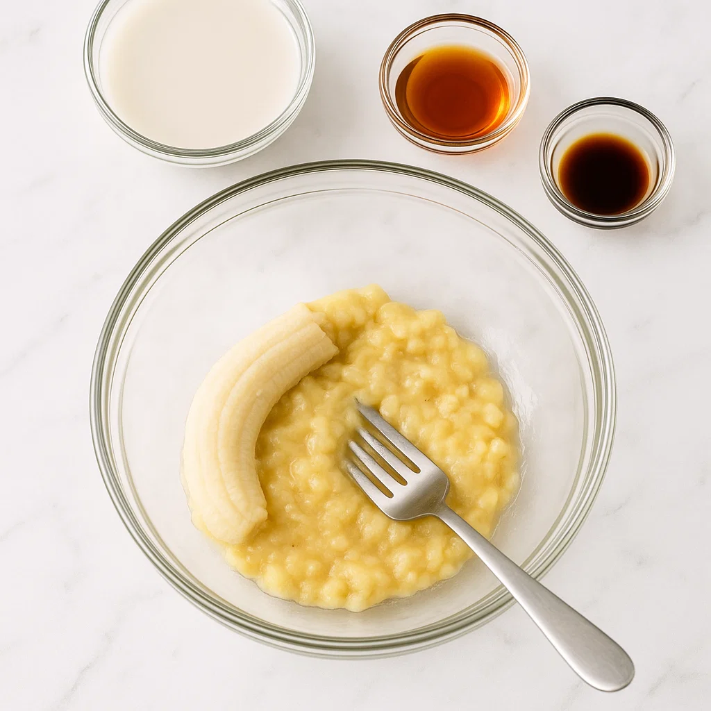 - In a large bowl, mash the ripe banana with a fork until smooth.