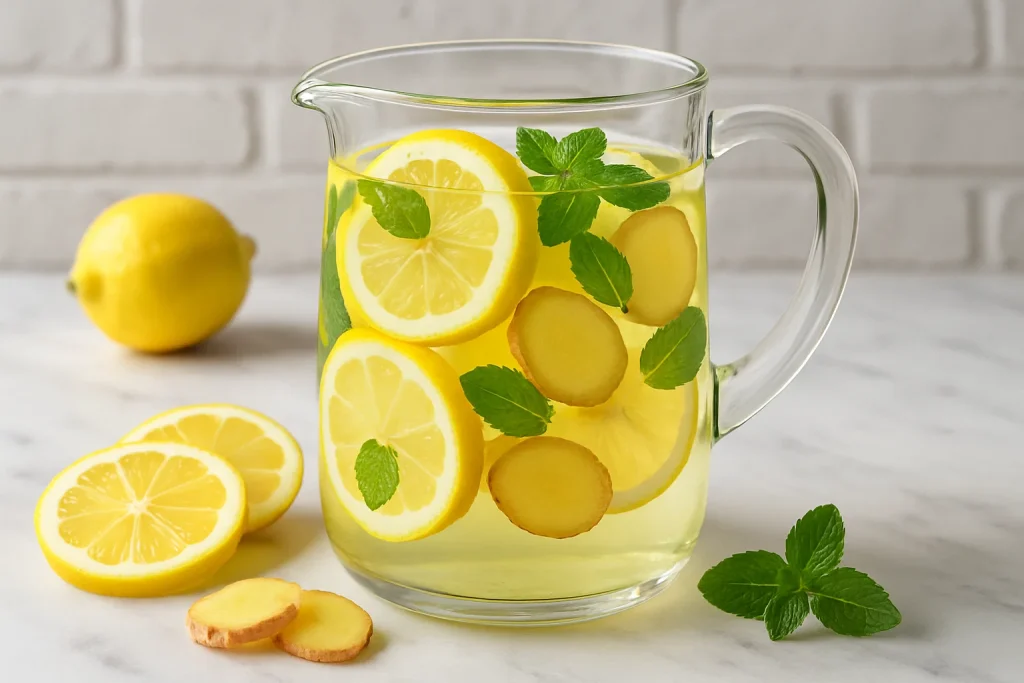 In a large pitcher, add the lemon slices and ginger slices. Pour in the water and stir gently to combine. If you are using honey to sweeten it, add it to the water at this point. You can also add a few mint leaves for a refreshing touch.