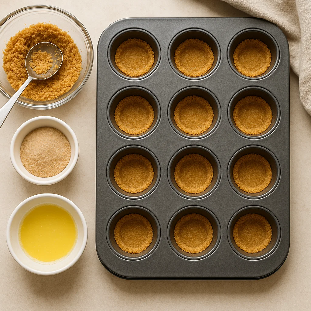 Press the mixture into the bottom of a mini muffin pan to form the crust. Use a spoon or your fingers to compact the crumbs.