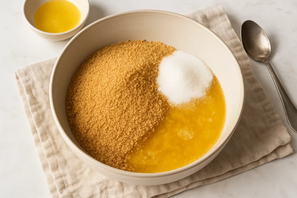 Mix graham cracker crumbs, sugar and melted butter in a bowl.