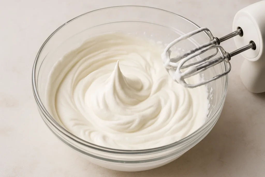 Whip the heavy cream in another bowl until stiff peaks form.
