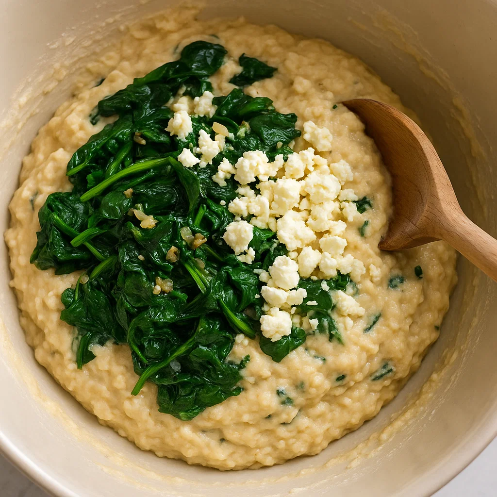 Next, stir in the sautéed spinach, garlic and crumbled feta cheese. The feta will add a rich, tangy flavor that perfectly complements the flavorful spinach.