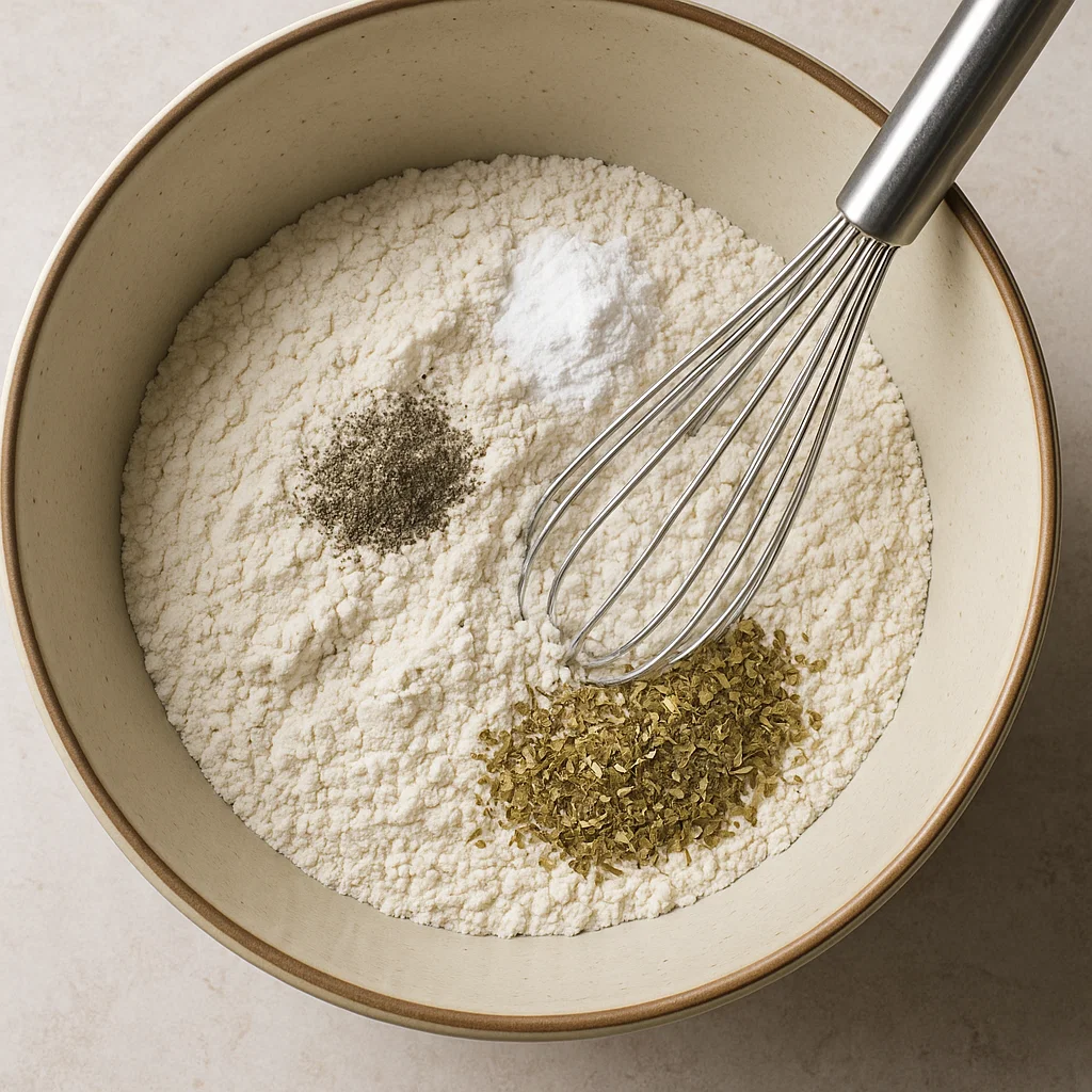 In a large bowl, combine flour, baking powder, salt, black pepper and dried oregano. Make sure the baking powder is evenly distributed throughout the dry ingredients so your muffins rise evenly.