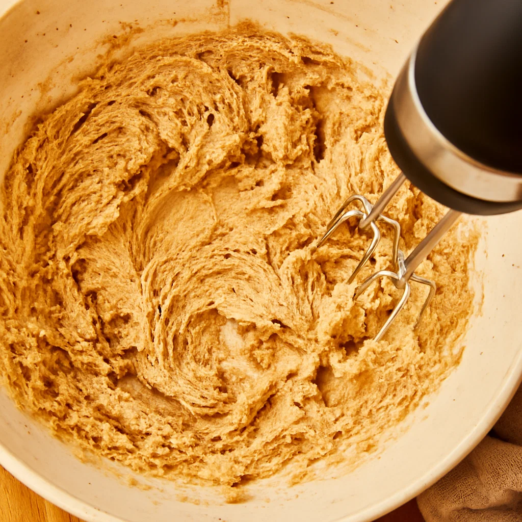 - In a large bowl, beat the softened butter And brown sugar together until light and fluffy, about 3-4 minutes using an electric mixer. The butter should be completely creamed and the sugar should be well incorporated.