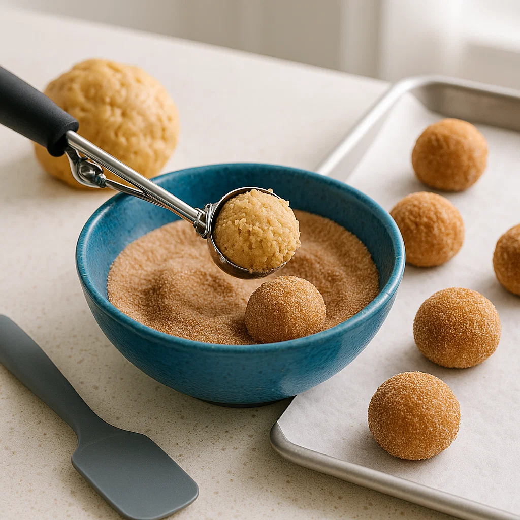 In a small bowl, mix the rest 1/2 cup granulated sugar And 1/4 cup cinnamon sugar. Use a tablespoon or cookie scoop to form balls of dough, then roll each ball in the sugar and cinnamon mixture until completely coated.