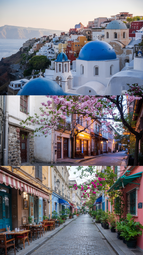 • Coastal chic aesthetic: whites, blues, flowing linens, lemon trees, and infinity pools in Santorini.