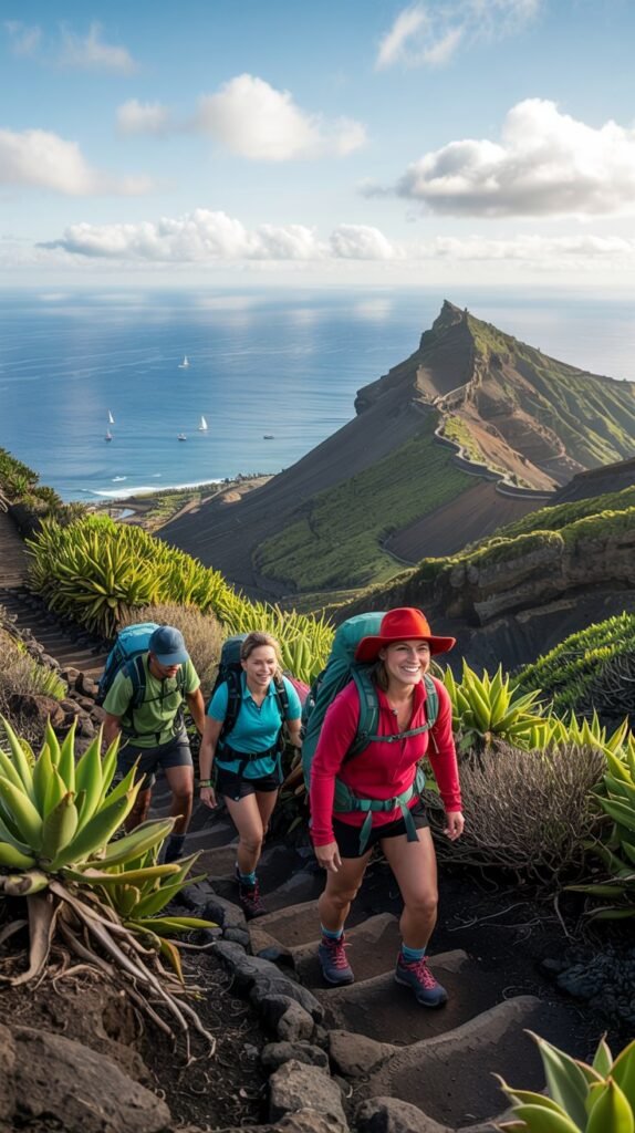 The hike to the top is moderate and offers panoramic views of the island’s diverse landscapes.